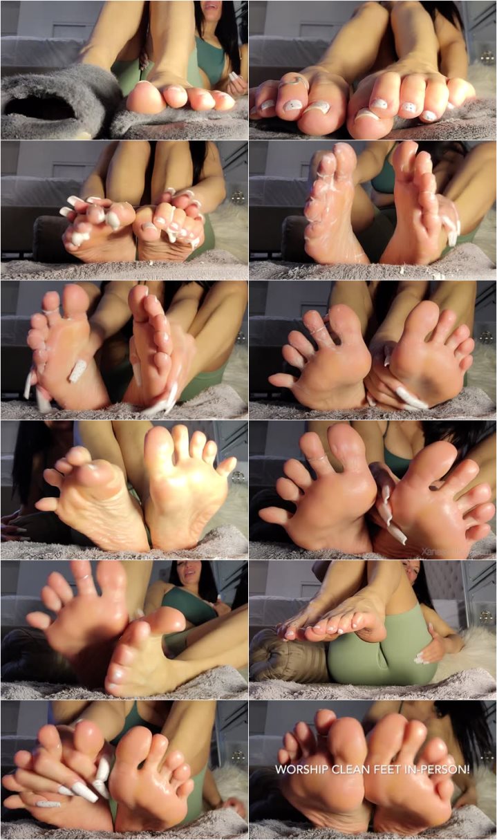 How lucky you are to be at the feet of Queen Xana right after her bath. She's ready for you to slather her perfect feet and toes with some soft, creamy lotion. She moans and sighs at the thought of your strong hands all over her Goddess feet and drives you wild with her soft, slippery soles!