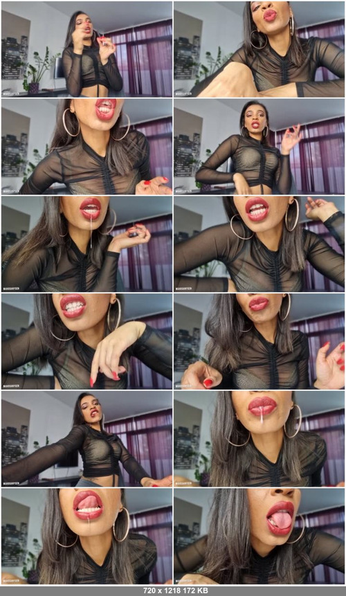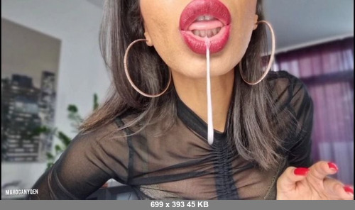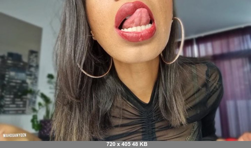 The full red lips and tongue of your dark-skinned goddess will quickly bring you to ecstasy. I want you to catch every, even the smallest drop of saliva that I feed you today. I tempt you with my tongue, with my mouth, spitting right into your face and lips. You are a faithful pet of your Mistress. Aren't you? You will accept the fact that the only thing I feed you is my Holy Saliva.